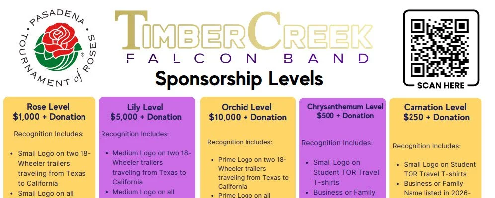 We are thrilled to announce that the Timber Creek High School Band has been selected to represent our community and the great state of Texas in the 2027 Tournament of Roses Parade in Pasadena, California!